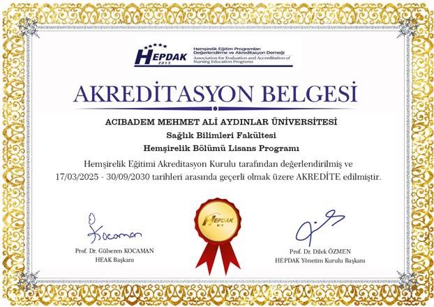 Son olarak, 17.03.2025 tarihinde yapılan HEAK toplantısında alınan karara göre Fakültemiz Hemşirelik Lisans Programı, 30.09.2030 tarihine kadar beş yıl süreyle “Tam Akredite” edilmiştir.