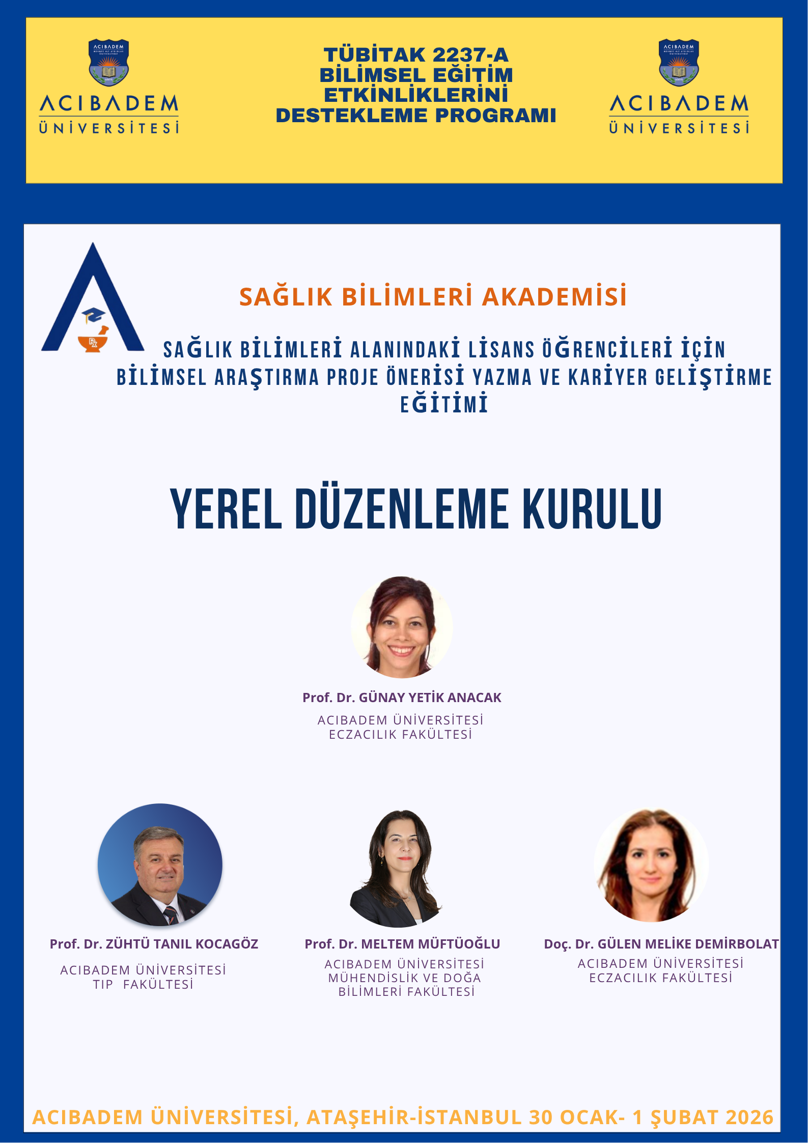 Sağlık Bilimleri Akademisi: Sağlık Bilimleri Alanındaki Lisans Öğrencileri İçin Bilimsel Araştırma Proje Önerisi Yazma ve Kariyer Geliştirme Eğitimi proje kabul edilmesi durumunda TÜBİTAK 2237-A Bilimsel Eğitim Etkinlikleri Desteği kapsamında 30 Ocak-1 Şubat 2026 tarihlerinde teorik ve uygulamalı olarak gerçekleştirilecektir.