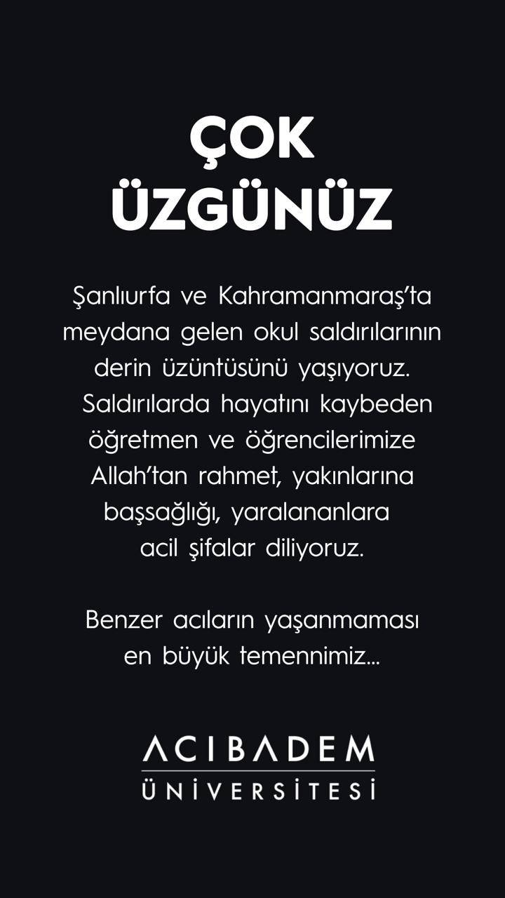 Şanlıurfa ve Kahramanmaraş’ta meydana gelen okul saldırılarının derin üzüntüsünü yaşıyoruz. Saldırılarda hayatını kaybeden öğretmen ve öğrencilerimize Allah’tan rahmet, yakınlarına başsağlığı, yaralananlara acil şifalar diliyoruz.