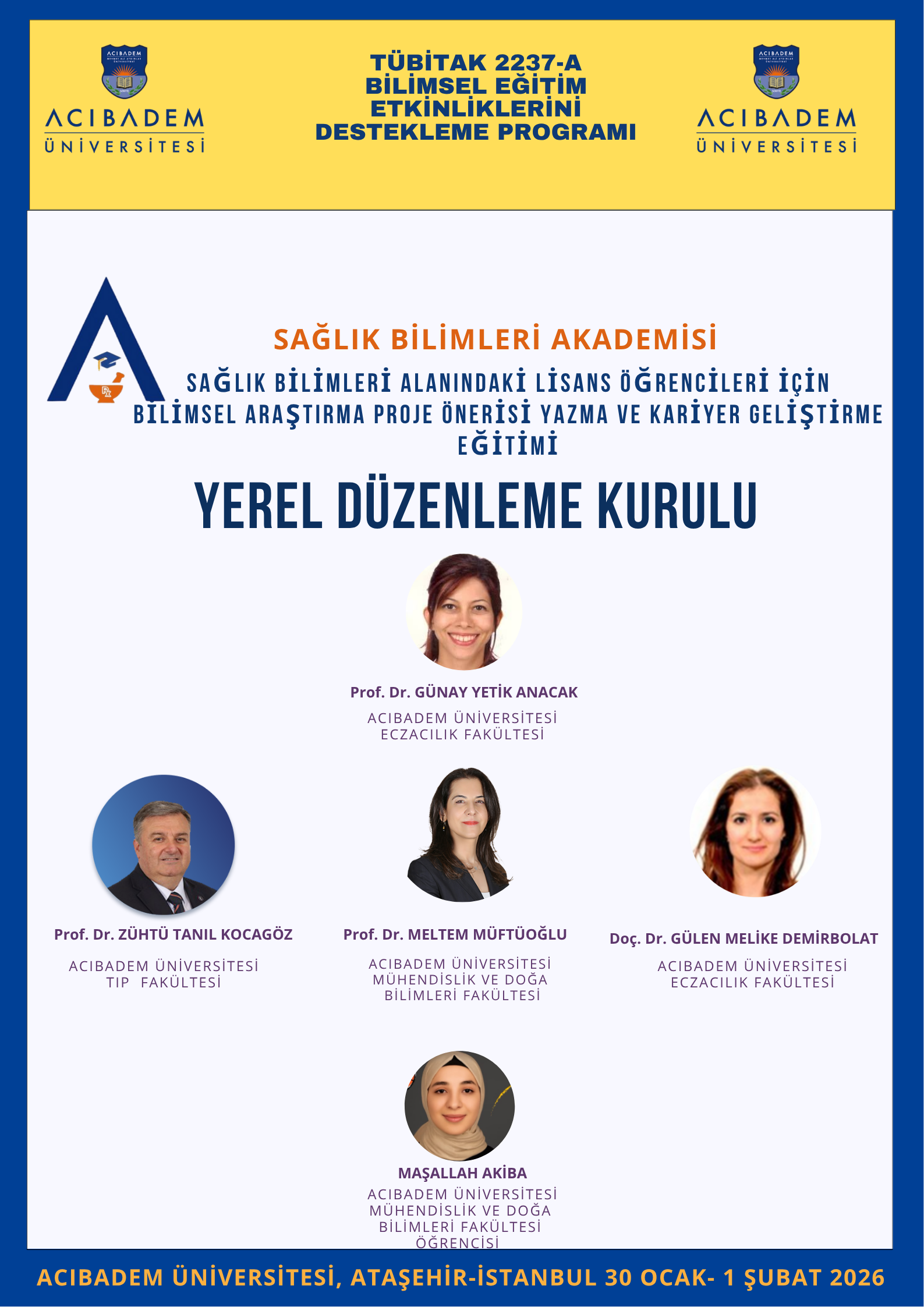 Within the scope of TÜBİTAK 2237-A Support Program for Scientific Education Activities, the Health Sciences Academy: Scientific Research Proposal Writing and Career Development Training for Undergraduate Students in the Field of Health Sciences will be held theoretically and practically between May 9-11, 2025.