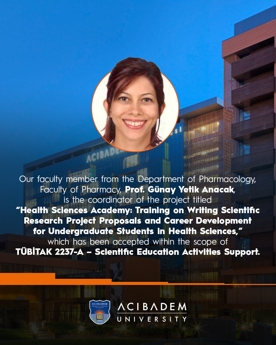 Our faculty member from the Department of Pharmacology, Faculty of Pharmacy, Prof. Günay Yetik Anacak, is the coordinator of the project titled “Health Sciences Academy: Training on Writing Scientific Research Project Proposals and Career Development for Undergraduate Students in Health Sciences,” which has been accepted within the scope of TÜBİTAK 2237-A – Scientific Education Activities Support.