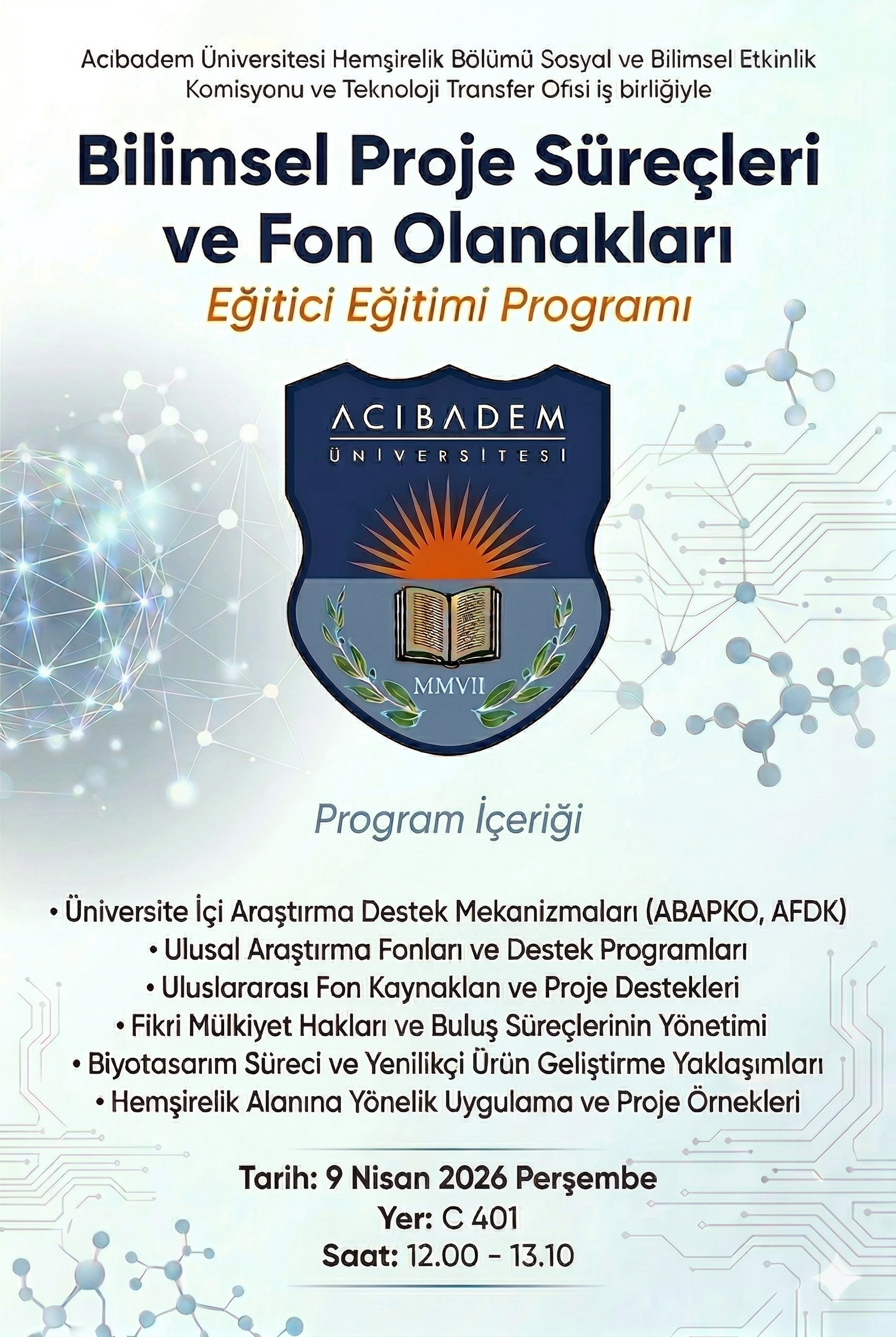 Acıbadem Mehmet Ali Aydınlar Üniversitesi Hemşirelik Bölümü Sosyal ve Bilimsel Etkinlik Komisyonu ile Teknoloji Transfer Ofisi iş birliğinde düzenlenen “Bilimsel Proje Süreçleri ve Fon Olanakları Eğitici Eğitimi Programı”, 9 Nisan 2026 tarihinde gerçekleştirildi.