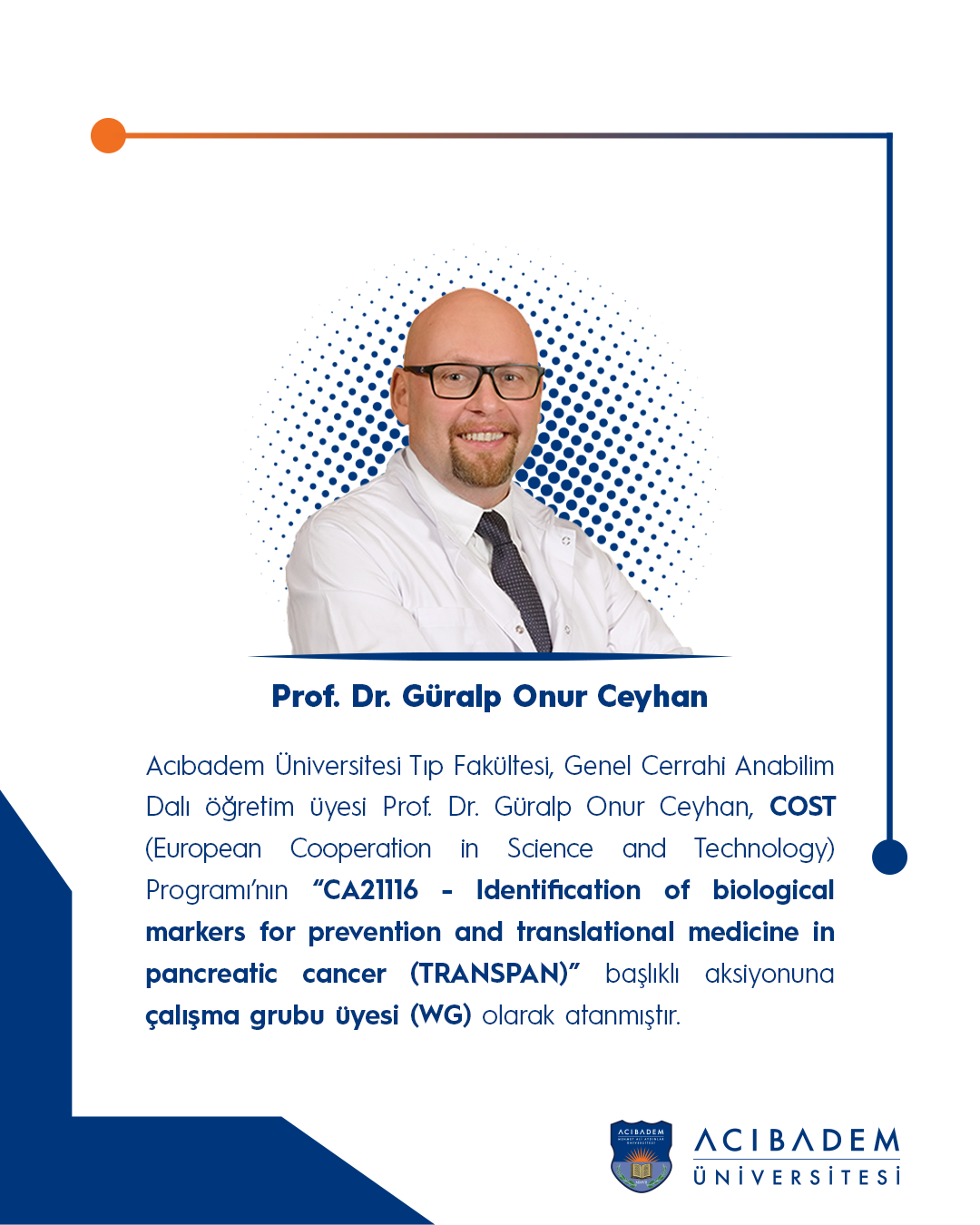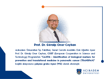 Acıbadem Üniversitesi Tıp Fakültesi, Genel Cerrahi Anabilim Dalı öğretim üyesi Prof. Dr. Güralp Onur Ceyhan, COST (European Cooperation in Science and Technology) Programı’nın “CA21116 - Identification of biological markers for prevention and translational medicine in pancreatic cancer (TRANSPAN)” başlıklı aksiyonuna çalışma grubu üyesi (WG) olarak atanmıştır.
