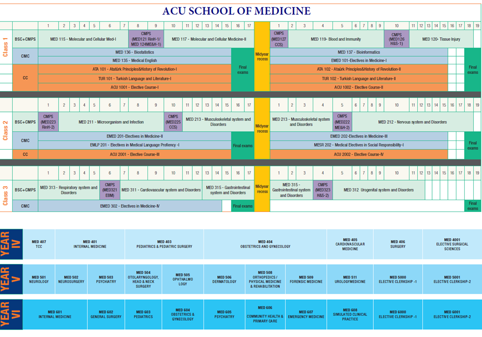 - Entegre Tıp Dersleri: Biyomedikal Ders Kurulları (BSC) ve Klinik Tıp ve Mesleki Beceriler (CMPS) programlarından oluşur.