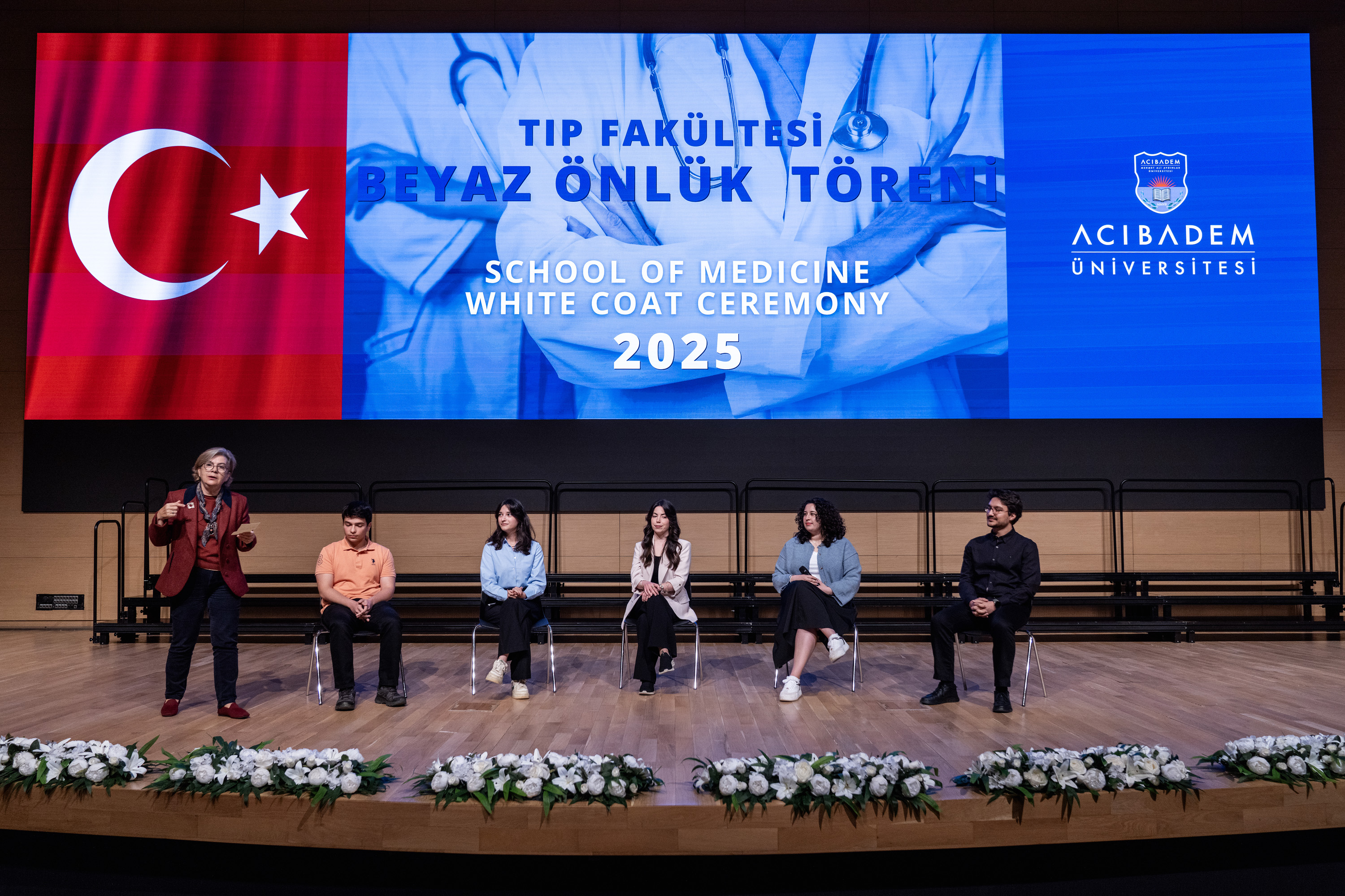Mütevelli Heyeti Başkanı Mehmet Ali Aydınlar, Kerem Aydınlar Vakfı Başkanı Seher Aydınlar ve Rektörümüz Prof. Dr. Ahmet Şahin ile Rektör Yardımcılarımız Prof. Dr. Güldal Süyen, Prof. Dr. İrfan Güney ve Prof. Dr. Levent Altıntaş’ın da katılımıyla gerçekleşen tören, Prof. Dr. Nadi Bakırcı’nın genç hekim adaylarına hitaben yaptığı açılış konuşmasıyla başladı. Ardından, Tıp Eğitimi Anabilim Dalı Öğretim Üyesi Doç. Dr. Melike Şahiner’in moderatörlüğünde düzenlenen kısa panelde, tıp fakültesi mezun ya da eğitimlerinin farklı dönemlerinde bulunan tıp fakültesi öğrencileri yeni başlayanlara kendi eğitim süreçlerinden deneyimlerini aktardı.