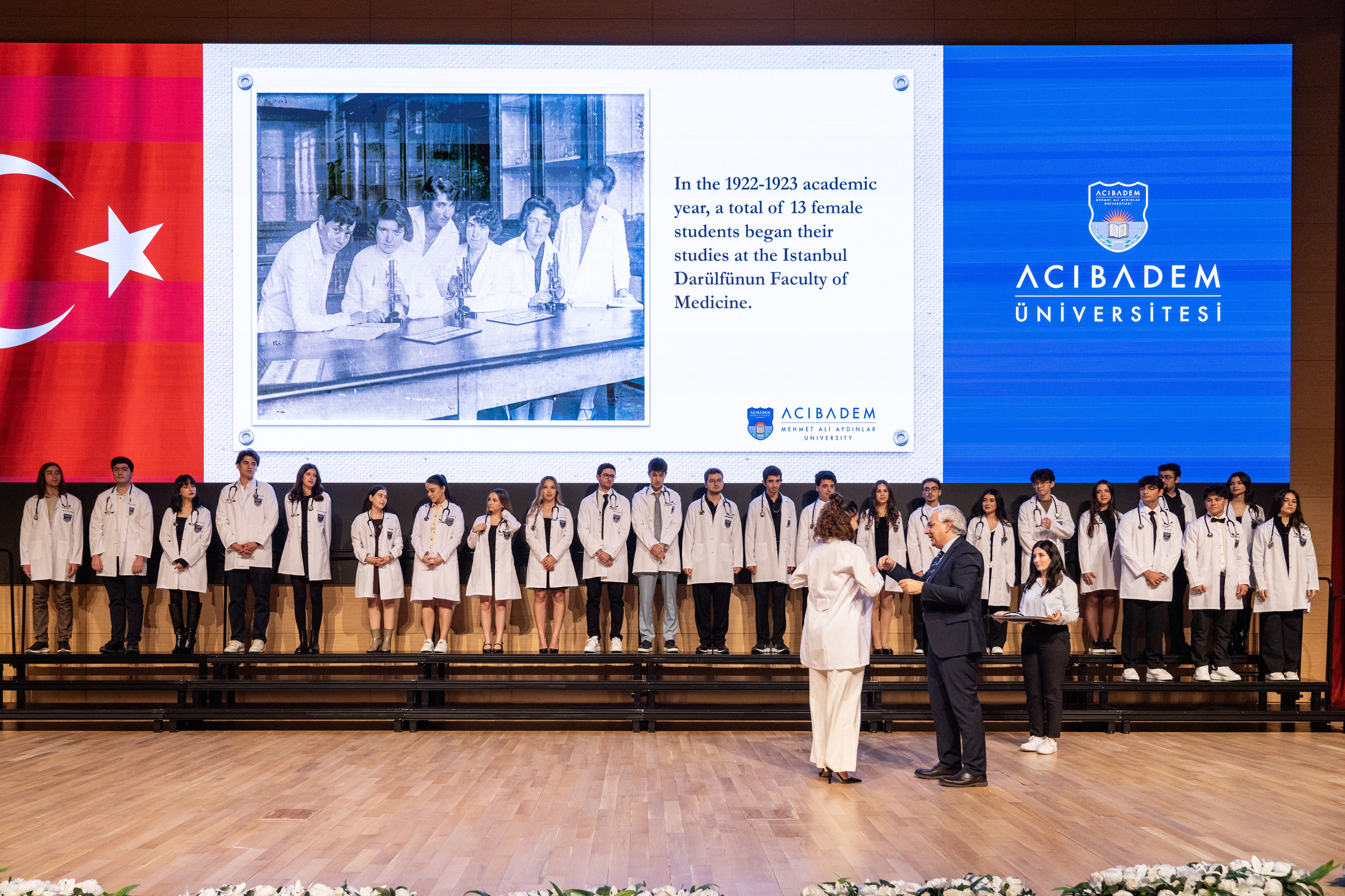 Tıp Fakültesi’nin geleneksel Beyaz Önlük Giyme Töreni, 21 Ekim 2024 tarihinde, Acıbadem Üniversitesi, konferans salonunda gerçekleştirildi. 1. sınıfa başlayan geleceğin hekimleri, tıp eğitimlerinin ilk adımını temsil eden isimlerine özel olarak hazırlanmış beyaz önlüklerini ve stetoskoplarını Tıp Fakültesi Dekanı Prof. Dr. Nadi Bakırcı’nın elinden giydiler.