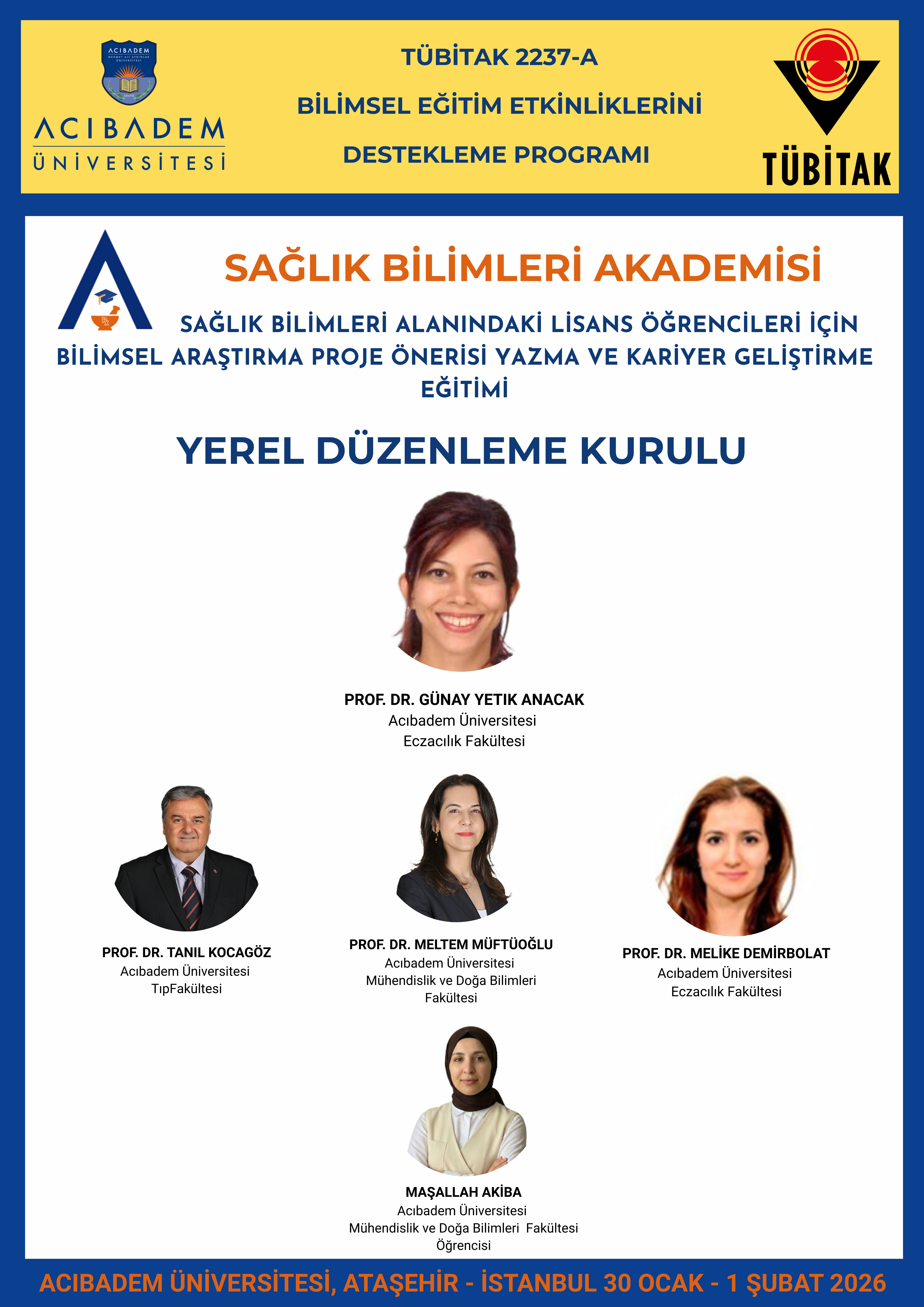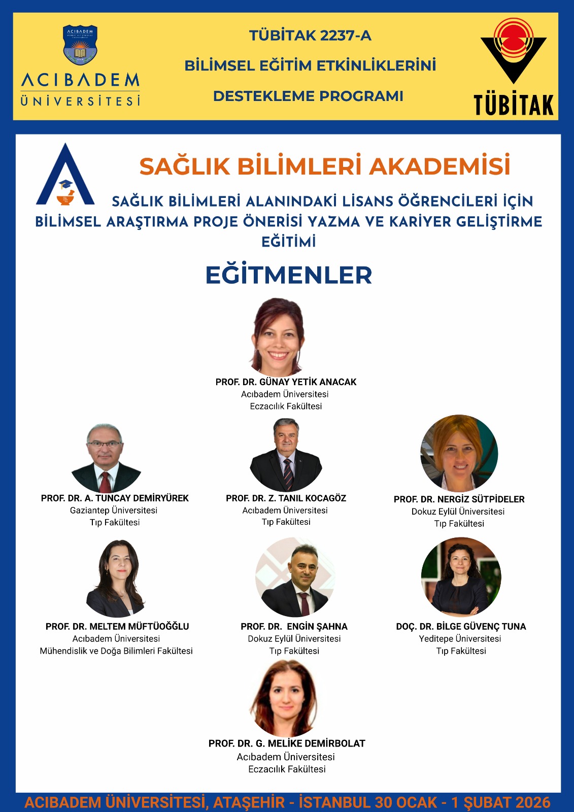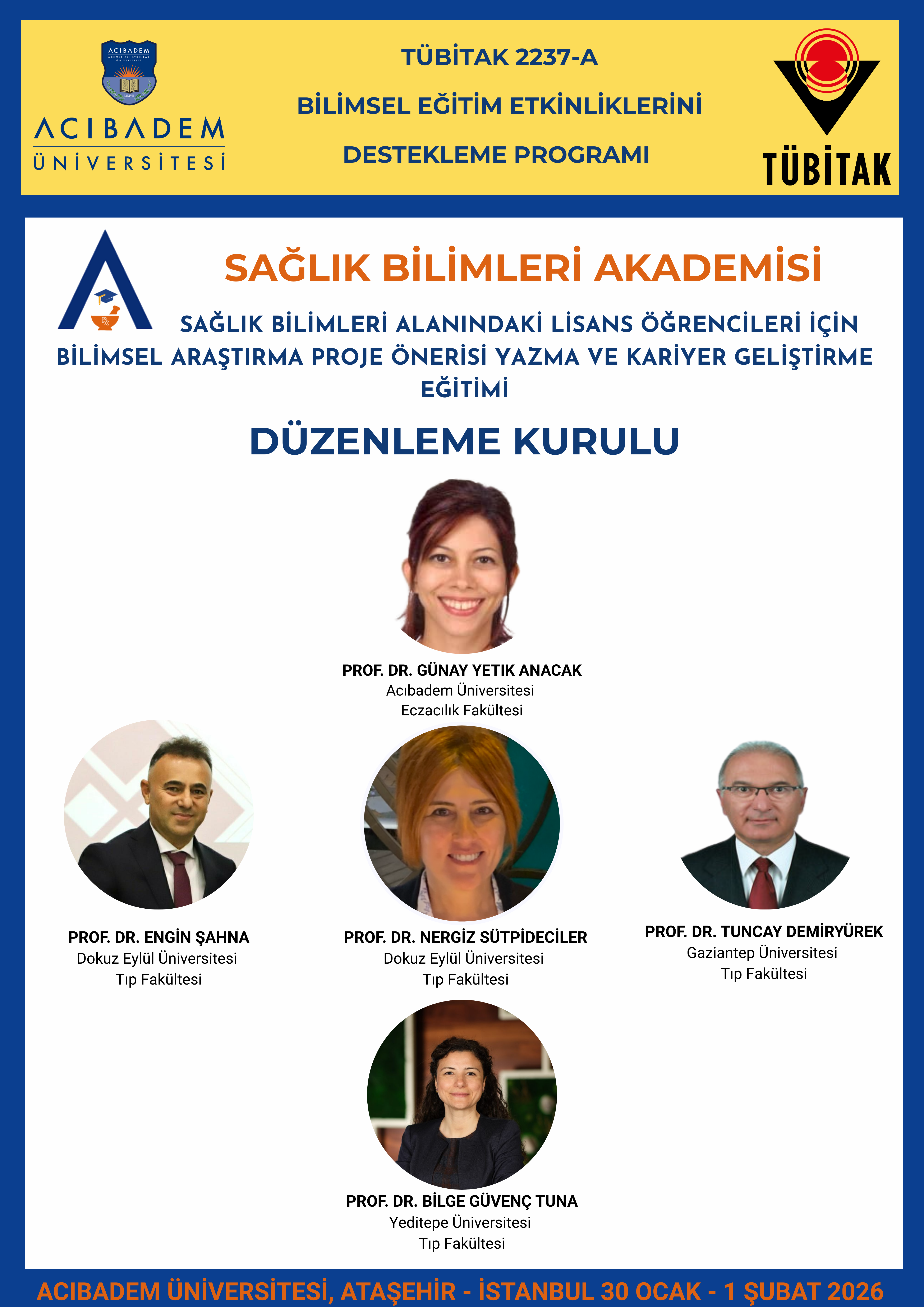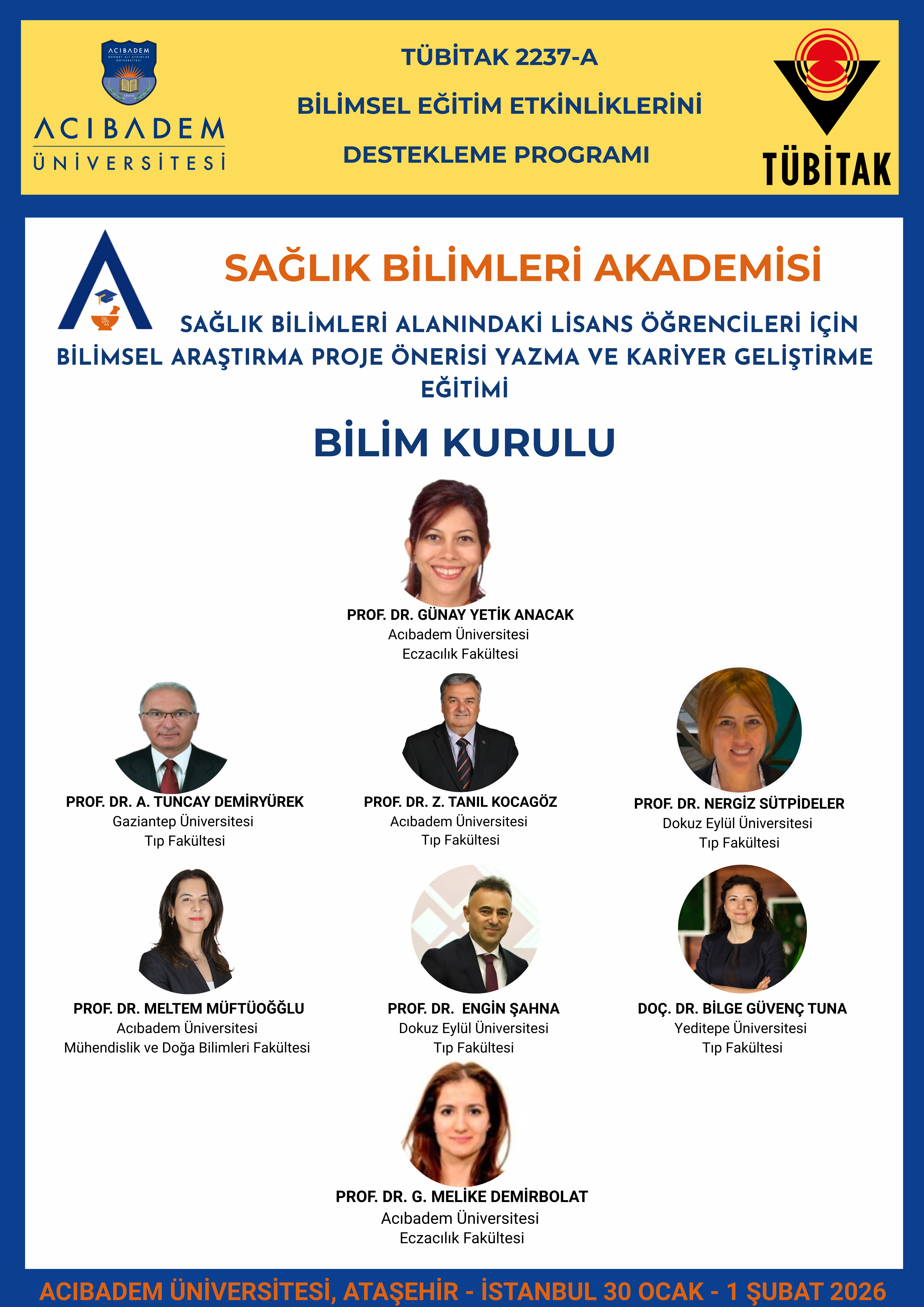 Sağlık Bilimleri Akademisi: Sağlık Bilimleri Alanındaki Lisans Öğrencileri İçin Bilimsel Araştırma Proje Önerisi Yazma ve Kariyer Geliştirme Eğitimi projesi TÜBİTAK 2237-A Bilimsel Eğitim Etkinlikleri Desteği kapsamında TÜBİTAK tarafından desteklenmeye hak kazanmıştır. 30 Ocak-1 Şubat 2026 tarihlerinde teorik ve uygulamalı olarak gerçekleştirilecektir.