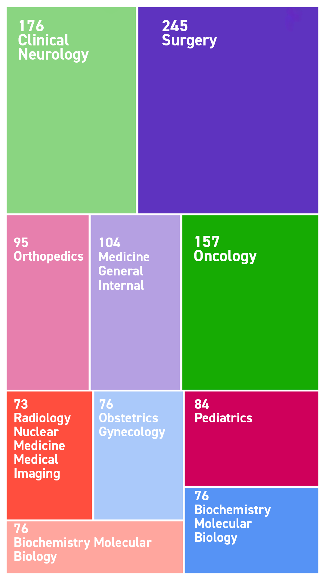 When the field distribution of articles published between 2020 and 2024 is examined according to WoS data, studies in surgery, neurology, oncology, internal medicine, and pediatrics stand out (Figure 1).