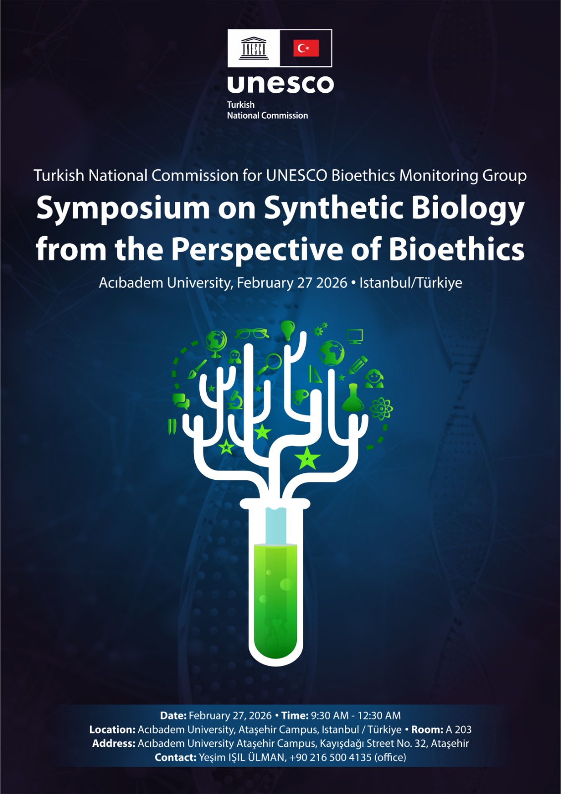 The UNESCO Turkish National Commission Bioethics Monitoring Committee and Acibadem University School of Medicine, History of Medicine and Ethics Departmentwill jointly organize the "Symposium on Synthetic Biology from the Perspective of Bioethics" on February 27, 2026, at Acibadem University's Ataşehir Campus. The symposium is free of charge and open to all interested parties.