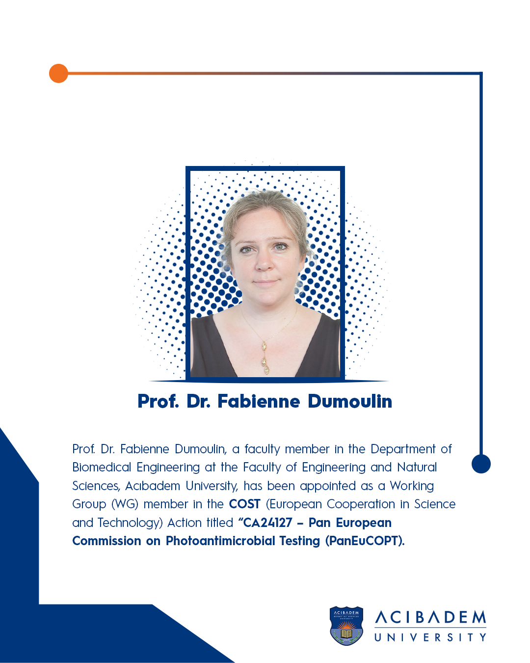 Prof. Dr. Fabienne Dumoulin, a faculty member in the Department of Biomedical Engineering at the Faculty of Engineering and Natural Sciences, Acıbadem University, has been appointed as a Working Group (WG) member in the COST (European Cooperation in Science and Technology) Action titled “CA24127 – Pan European Commission on Photoantimicrobial Testing (PanEuCOPT).