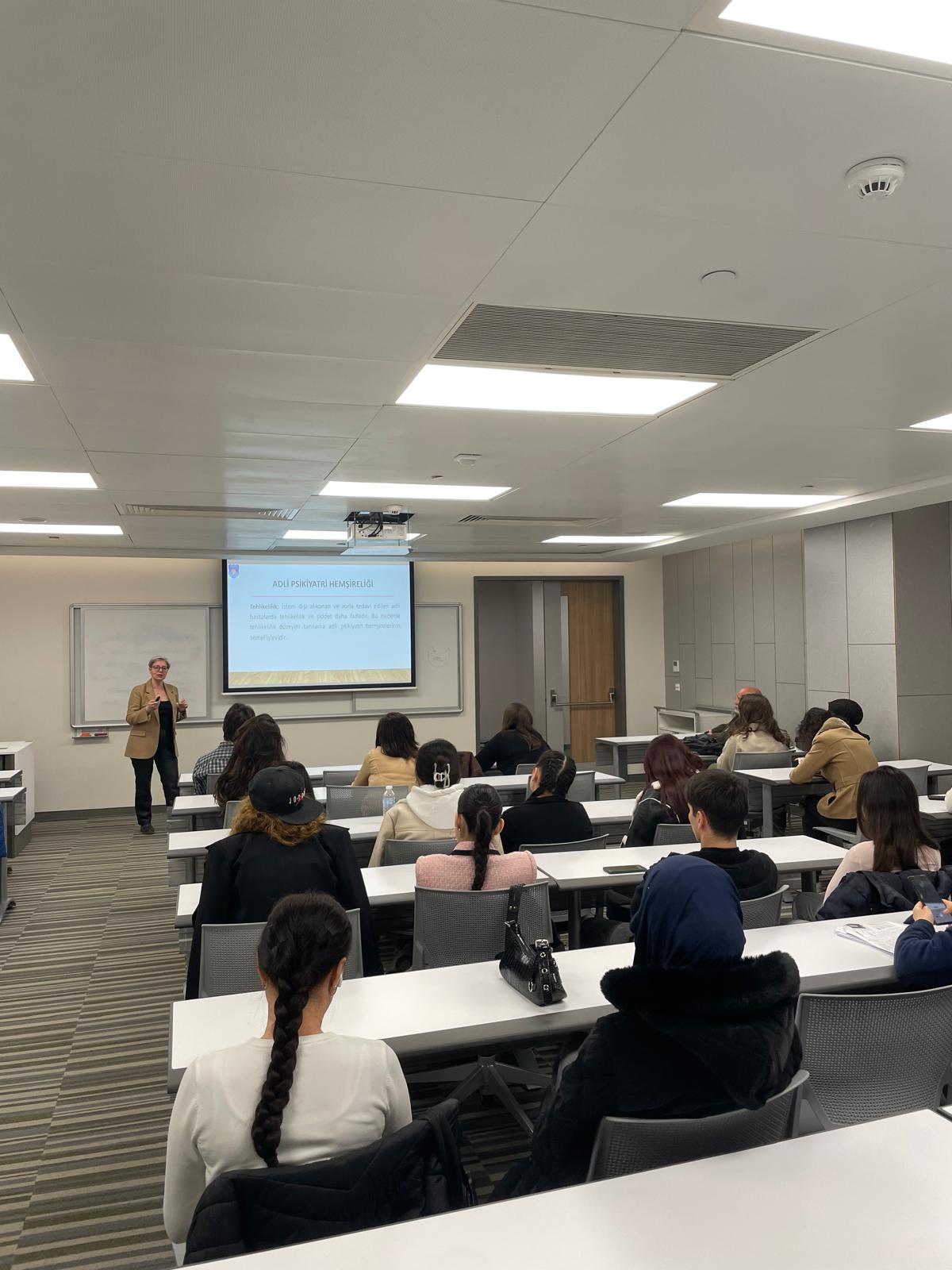 Seminerde, Prof. Dr. Yasemin Kutlu (Acıbadem Mehmet Ali Aydınlar Üniversitesi Hemşirelik Bölümü) Adli Hemşirelik ve Adli Psikiyatri Hemşireliği alanlarına ilişkin kapsamlı bir sunum gerçekleştirdi. Etkinlik kapsamında, adli hemşireliğin tanımı, çalışma alanları ve görev aldıkları kurumlar ele alındı. Ayrıca suç ve suçlu davranış özellikleri incelenerek, bireylerin suç davranışı geliştirmesinde etkili olabilecek biyopsikososyal faktörler tartışıldı.