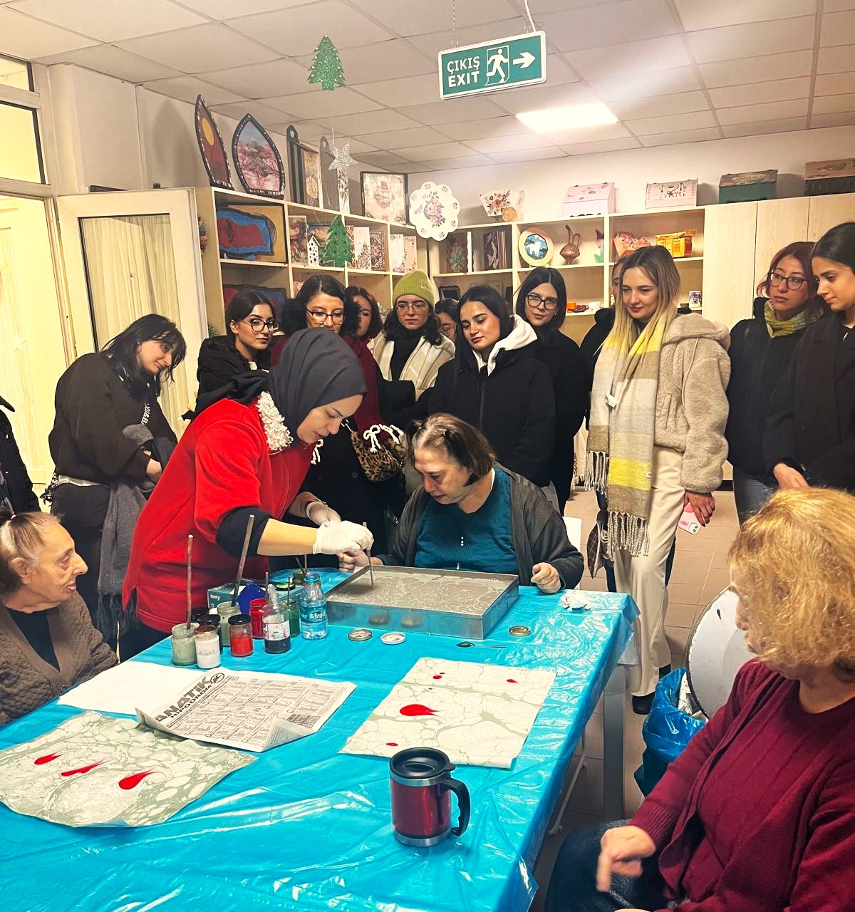 Ziyaret süresince Darülaceze sakinleriyle samimi bir iletişim ortamı oluşturuldu; karşılıklı sohbetler ve paylaşımlarla sıcak bir buluşma gerçekleşti. Etkinlik kapsamında öğrenciler ve öğretim elemanları, katılımcılarla birlikte ebru çalışmaları, ahşap boyama ve çeşitli el sanatları etkinliklerine katıldı. Bu uygulamalar, yaşlı bireylerin aktif katılımını destekleyerek motor, bilişsel ve duygusal süreçlerinin güçlendirilmesine katkı sağladı.