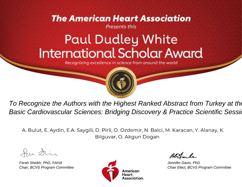Üniversitemiz Tıp Fakültesi Translasyonel Tıp Doktora Programı öğrencileri Aybike Bulut ve Eylül Aydın ile Tıp Fakültesi Dönem IV öğrencileri Eyüp Alper Saygılı ve Doğukan Pirli’nin, Tıbbi Genetik Anabilim Dalı öğretim üyeleri Doç. Dr. Özlem Akgün Doğan ve Dr. Öğr. Üyesi Kaya Bilgüvar danışmanlığında ve ACURARE çalışma grubunun katkılarıyla yürüttükleri “A Novel Variant in GNB2 as a Cause of Sick Sinus Syndrome” başlıklı çalışmaları, The American Heart Association Paul Dudley White International Scholar Award ödülüne layık görüldü.